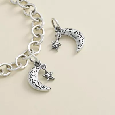Delicately detailed on both sides, available in sterling silver or 14K gold, the Adorned Starry Night Charm features a crescent moon with a small, dangling star. It makes a sweet celestial statement on any bracelet, charm necklace or chain.