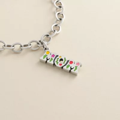 This sterling silver “Mom” charm is hand-painted with enamel flowers to celebrate the beauty of a mother’s unconditional love.