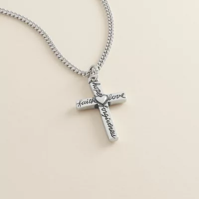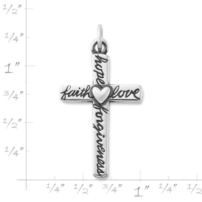 This classic sterling silver cross features a small heart at its center and four words to live by: hope, love, forgiveness and faith. The back of this design can be engraved with special initials, symbols or dates.