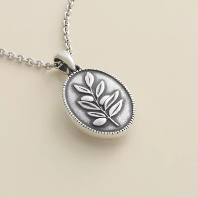 Featuring an olive branch on the front and a simple cross on the back, this sterling silver pendant is a detailed reminder of peace and hope.