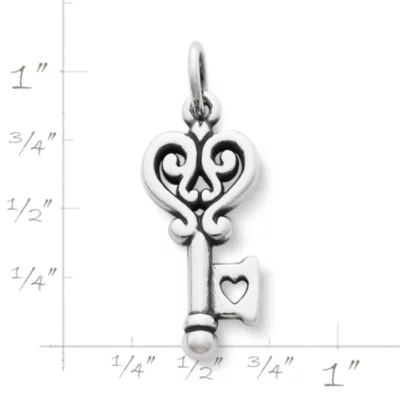 This sterling silver key is lovingly embellished with hearts and scrolls. This charm is an ideal choice for charm bracelets or chains.