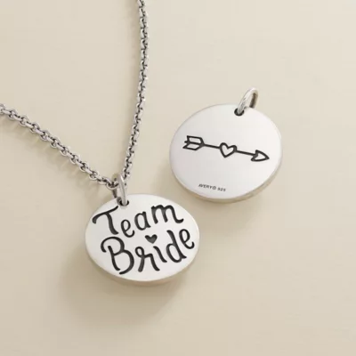 This design is retiring from our active line and once the remaining stock is sold, it will no longer be available. For the girls (and guys) who have always stood by your side, let them know they’re “Team Bride” with this sterling silver disc charm. The back is accented with a small heart and arrow, with room for engraving names, dates and more.
