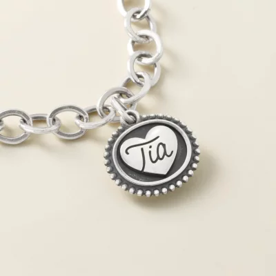 Express your love for your aunt with this Mexican-art-inspired sterling silver charm. Featuring a beaded border that wraps around and embraces a heart filled with a scripted endearment (“Tia,” which means aunt in Spanish). The back of this Spanish charm can be engraved with a name, birthdate or special message.