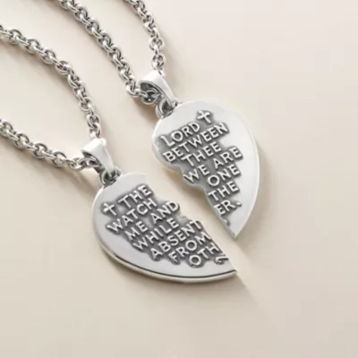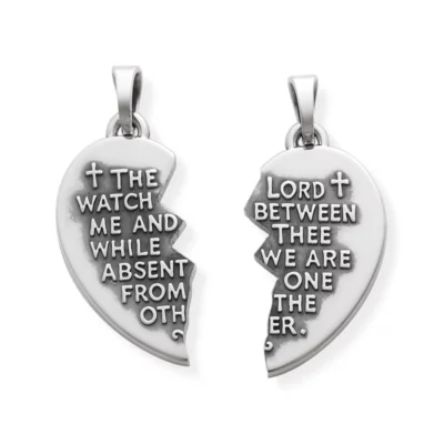 A simple symbol for two people who may be separated but remain united by faith and love, this design is inspired by the verse Genesis 31:49: “The Lord watch between me and thee while we are absent one from the other.” This pendant is crafted as one piece, then custom-cut to create two halves.